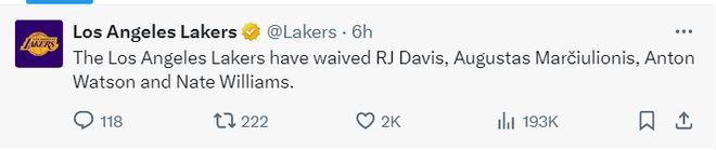 北京時間10月19日,洛杉磯湖人隊官方宣布裁掉奧古斯塔斯-馬爾丘利奧尼斯、RJ-戴維斯、內(nèi)特-威廉姆斯和安東-沃森四位訓(xùn)練營合同球員,這四人可以被南灣湖人簽下征戰(zhàn)G聯(lián)賽。