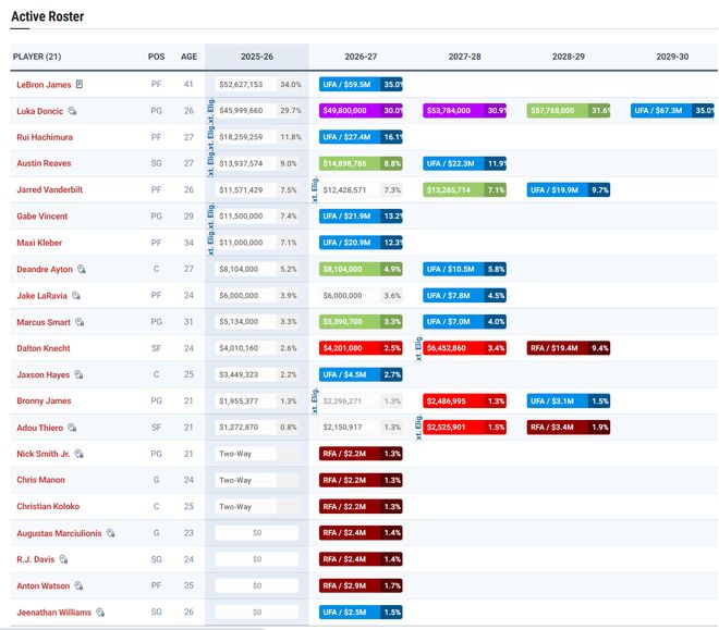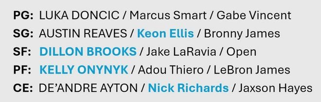 詹姆斯、東契奇、八村壘、里夫斯、范德比爾特、文森特、克勒貝爾、艾頓、拉拉維亞、斯馬特、克內(nèi)克特、海斯、布朗尼、蒂耶羅;科洛科、馬農(nóng)、小尼克-史密斯(三個雙向合同)