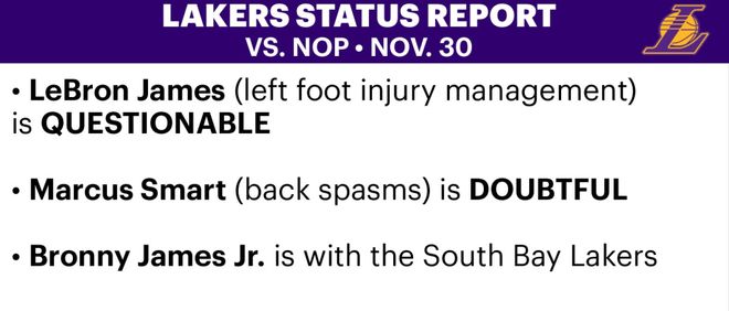北京時間11月30日,湖人更新了明天對陣鵜鶘的傷病報告,詹姆斯(左腳傷病管理)被列為出戰(zhàn)成疑(上場可能50%),斯馬特(背部痙攣)是大概率缺陣(上場可能25%),布朗尼下放發(fā)展聯(lián)盟,確定不會出戰(zhàn)比賽。